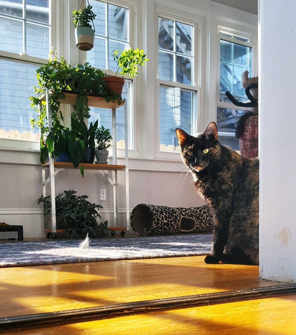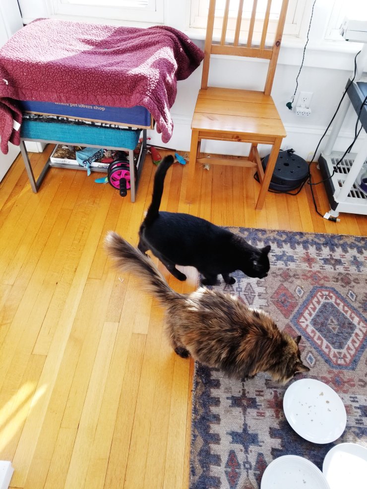 Even though I am super antsy, I have not sown any seeds. I am taking time to plan. I want to make sure that my space is functional. In the meantime, these two plump ladies follow me into the “cat room” whenever I go in there, because that is where they like to eat.