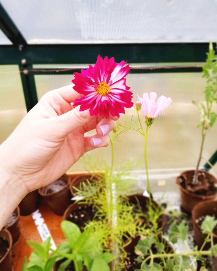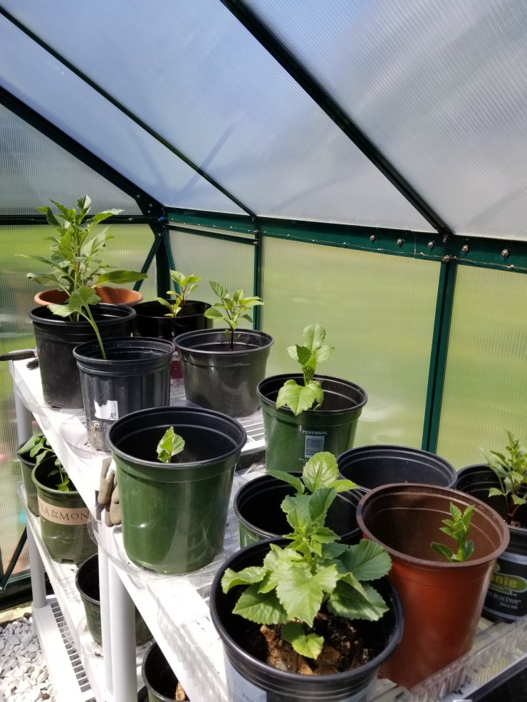 So now the greenhouse is up. It is quite small, but tall enough for my 5’8″ frame. My dahlias thrived in there until this weekend, and I also have some happy marigolds, and cucumber and pepper anf eggplant starts.