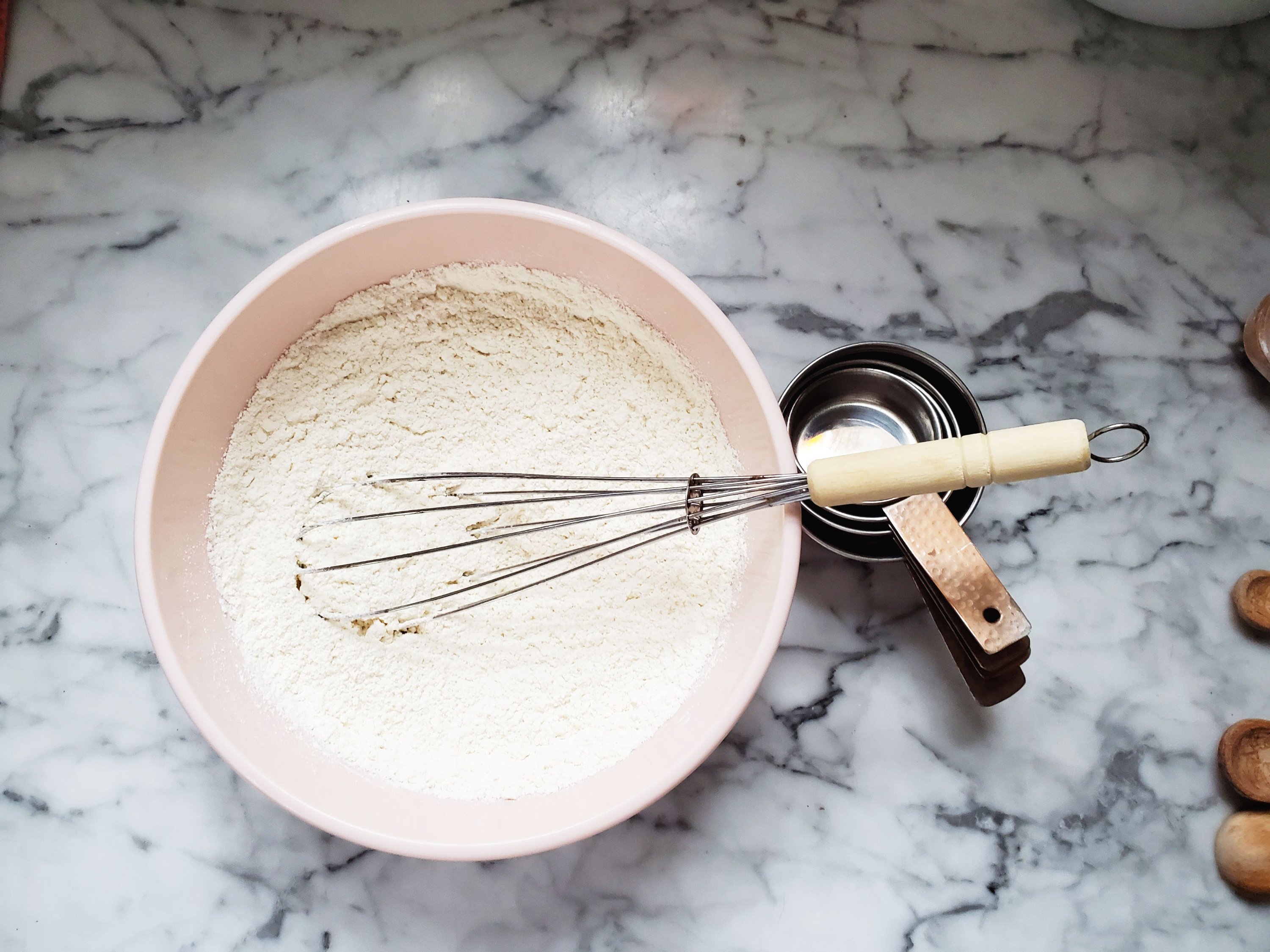 Whisk two cups flour, baking powder, and salt together in medium bowl.