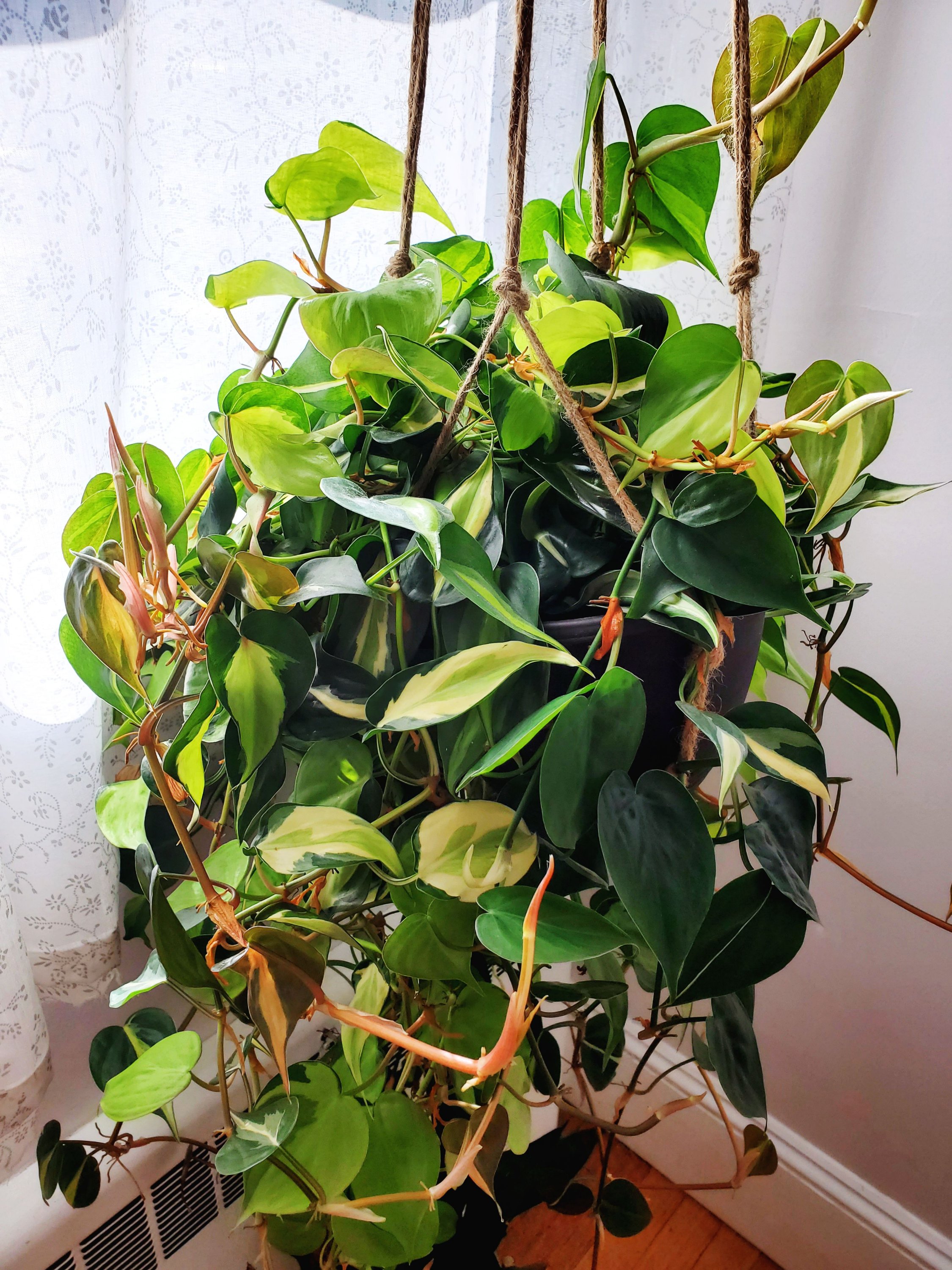 I have quite a few philodendrons because they are so easy to care for. Some are hard to find. The one you see above, philodendron brasil, was purchased at my local home improvement store. It’s doing great and literally requires zero maintenance except for a rare trim (mine is directly above a radiator so the ends get a bit crunchy in the winter) and water 2x/week. I take cuttings of this one often and they root easily. I even sold one on etsy! This one is in bright filtered light, but I have others that are in medium indirect light and are doing just fine. This philodenron tends to trail but other species do not.
